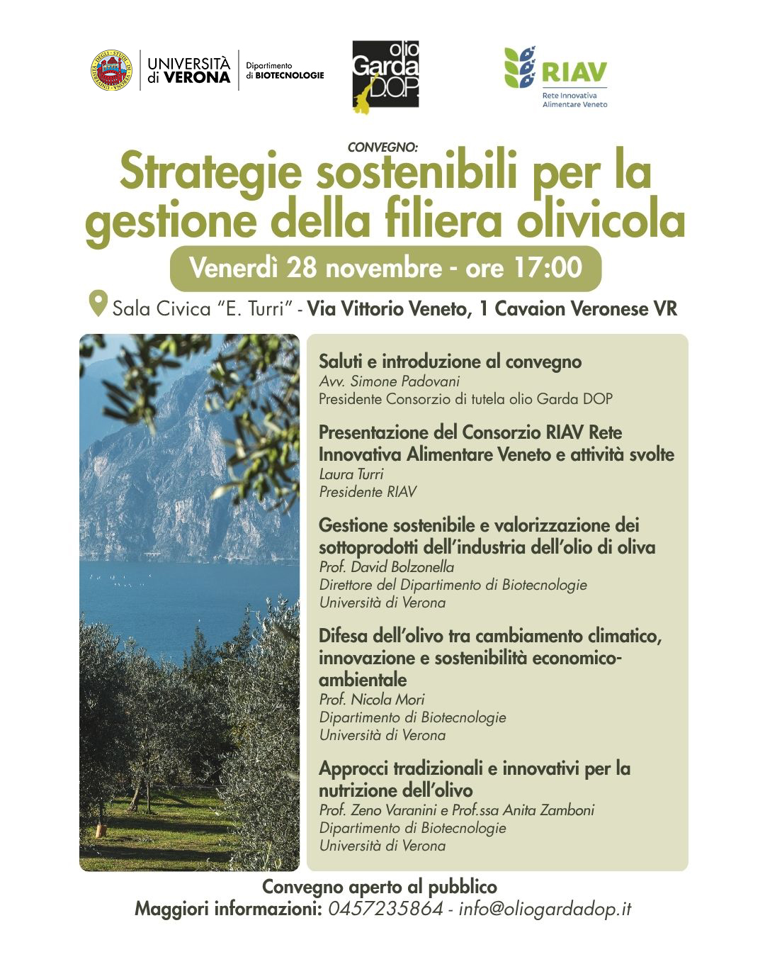 Venerdì 28 novembre 2025 alle ore 17:00 presso la Sala Civica “E. Turri” (Via Vittorio Veneto 1, Cavaion Veronese – VR) si terrà il convegno “Strategie sostenibili per la gestione della filiera olivicola”, organizzato dall’Università degli Studi di Verona – Dipartimento di Biotecnologie.