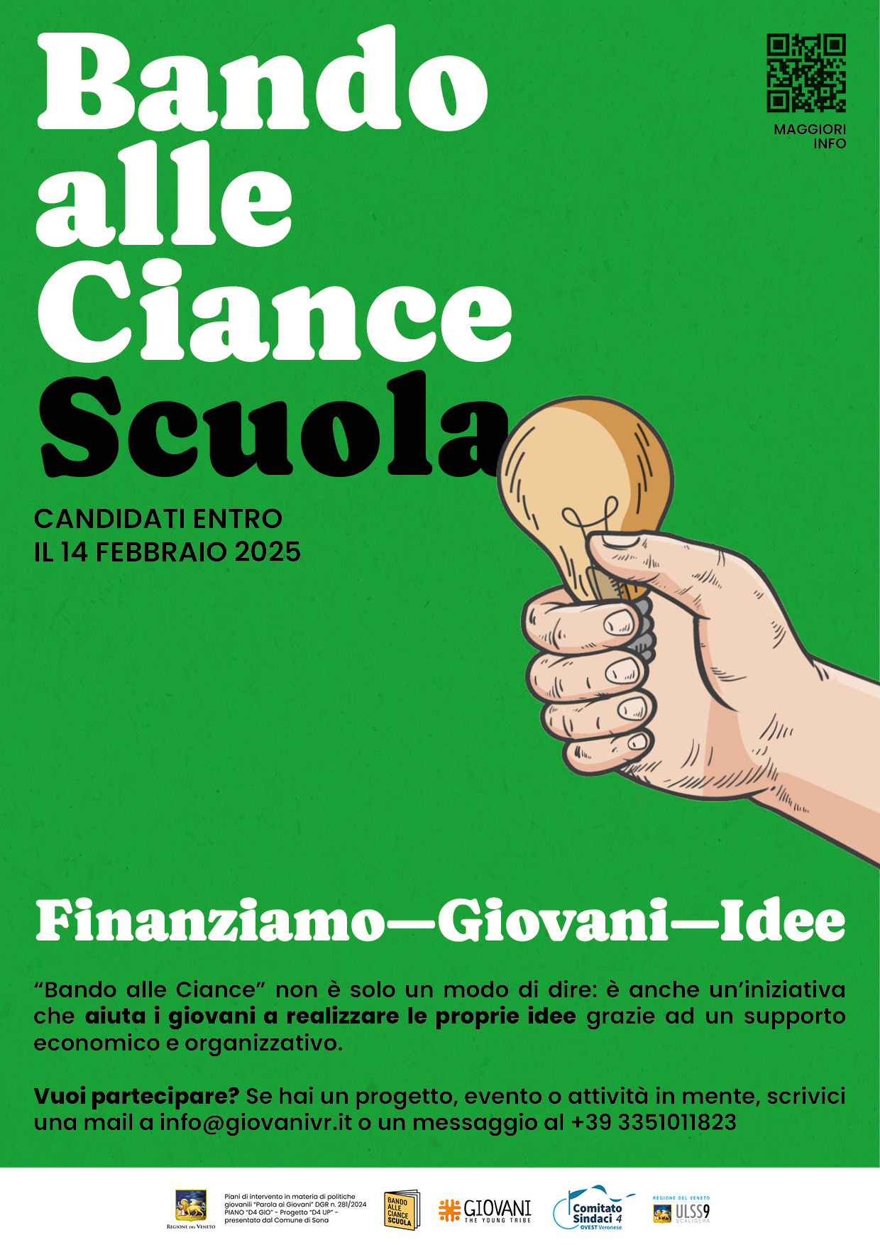 “Bando alle Ciance Scuola” è il bando di finanziamento che sostiene le idee promosse da giovani studenti e studentesse che vogliono progettare e realizzare attività nel contesto scolastico e sociale in cui vivono 🎓 Come? Con un finanziamento fino a 1000€!